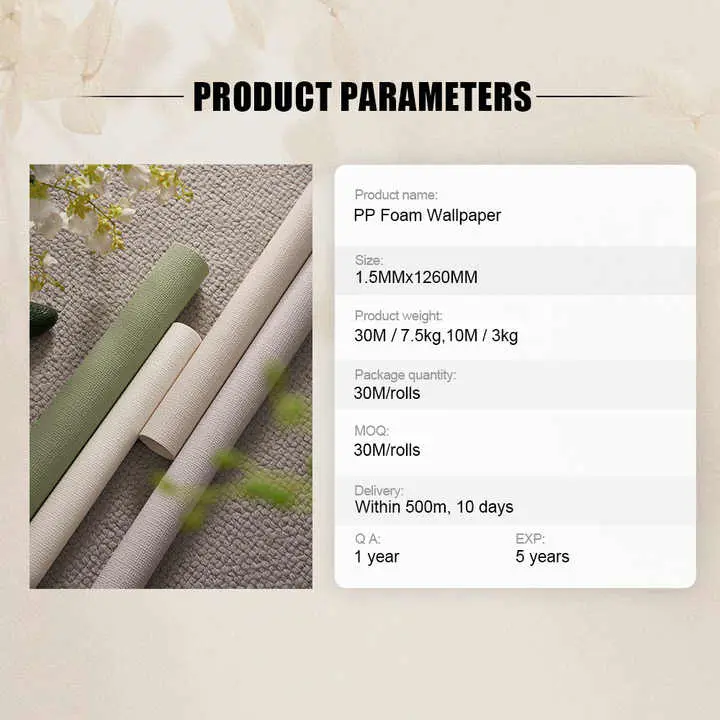 · Beneficii multifuncționale: Acest tapet oferă o serie de beneficii, inclusiv proprietăți anti-statice, izolație de căldură și o garanție de un an, oferind utilizatorilor liniște sufletească și o soluție de lungă durată pentru nevoile lor de proiectare interioară.